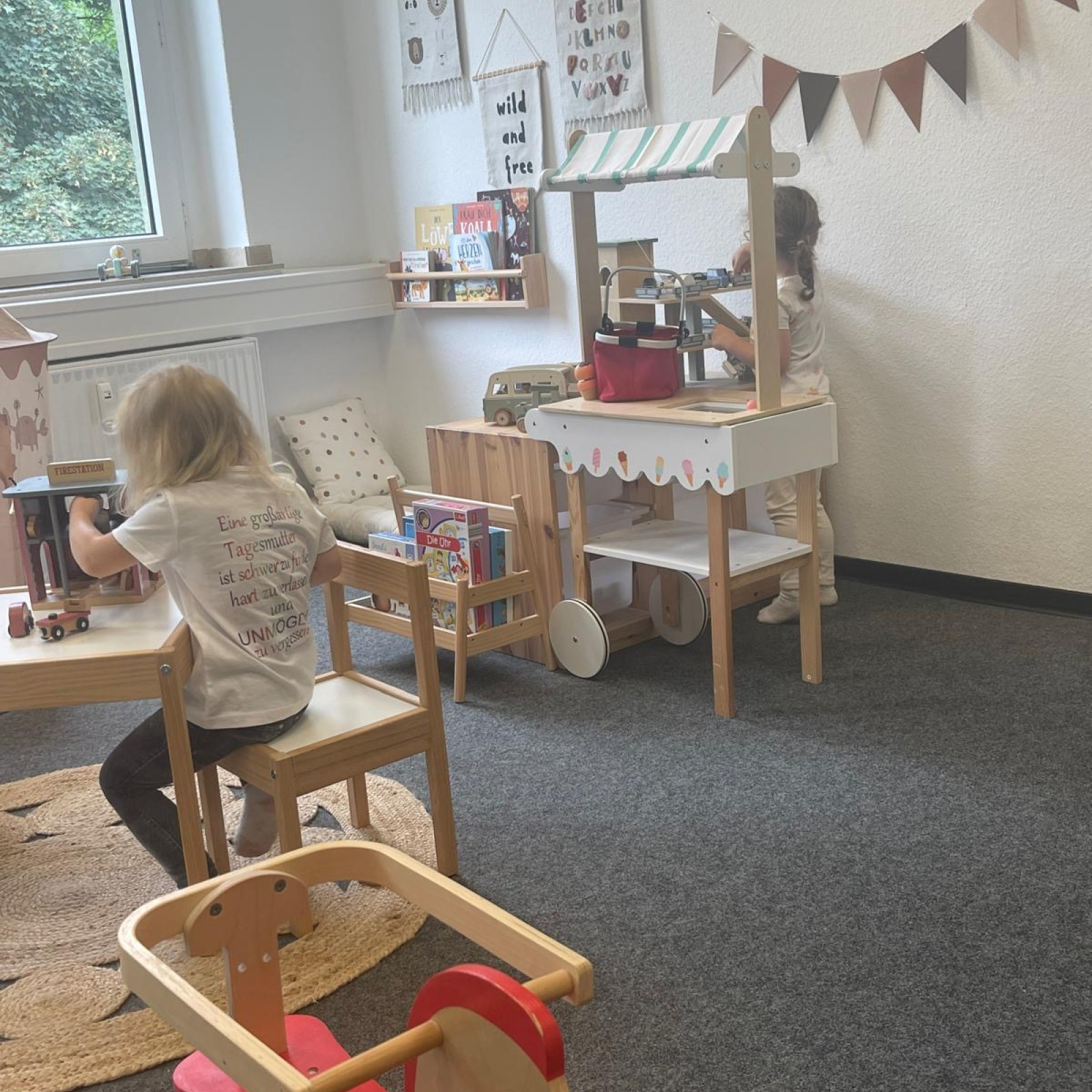 Kinder haben besondere Bedürfnisse an die Einrichtung: der Waschbereich hat einen Wickeltisch. Für den Mittagsschlaf oder um sich auszuruhen gibt es den Schlafbereich mit einer eigenen Matratze für jedes Kind und eine Kuschelecke. Die Küche ist besonders wichtig: hier bereiten wir – auch oft gemeinsam mit den Kindern – die Mahlzeiten zu und lassen es uns zusammen am großen Tisch schmecken. In den Räumen gibt es verschiedene Bereiche zum Basteln oder Spielen – manche Bereiche werden auch für verschiedene Anlässe umgeräumt. In den Räumen wird natürlich nicht geraucht.